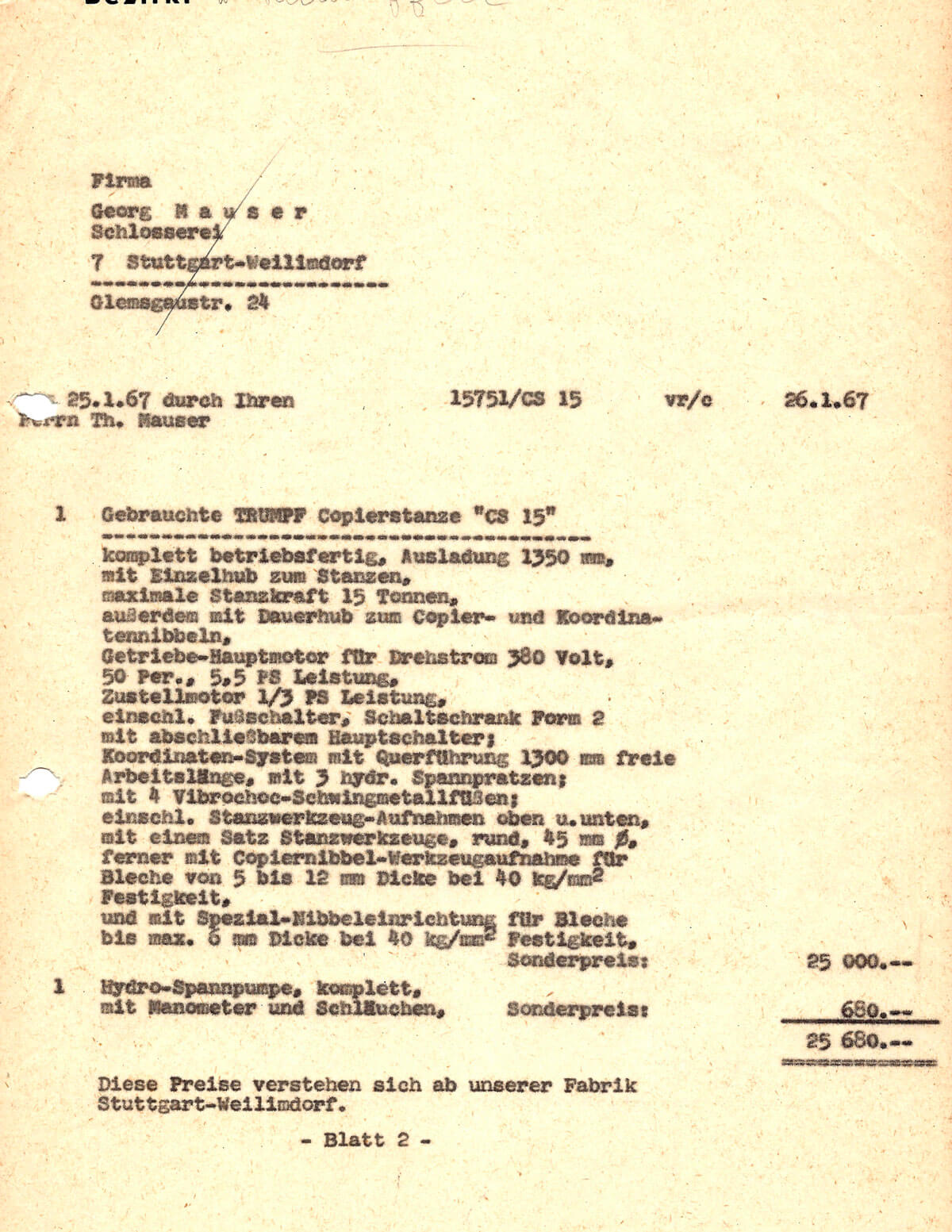 Kaufbeleg einer gebrauchten TRUMPF Copierstanze "CS 15" für 25.680,- DM